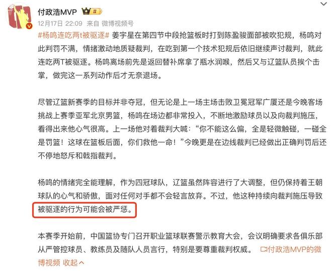 在最近结束的一场CBA常规赛中,辽宁男篮输给了北京男篮,无缘取得连胜。而在这一场比赛除了胜利备受关注之外,可能还有一点备受关注,那就是杨鸣被夺权驱逐的事情。当时这个事情发生在第四节的中段,辽宁男篮的姜宇星在一次抢篮板过程当中,打到对面陈盈骏的面部被吹犯规。而杨鸣在场下面对这个判罚非常不满,他直接情绪激动地去质疑裁判,一顿疯狂输出之后就被裁判吹了技术犯规。